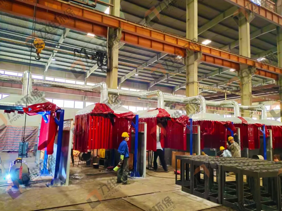 Fixed Suction Hoods: For the six fixed welding stations, Qingdao Power Space designed and matched a system of 1.8m x 1.8m fixed suction hoods. Each hood was equipped with four uprights and surrounded by arc-isolating curtains. This configuration created a semi-enclosed environment at each station, maximizing the capture efficiency of the pollutants while also protecting other workers from the bright arc light.