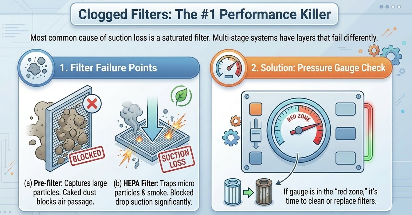The most common cause of suction loss is a saturated filter. In a multi-stage system, different layers fail at different rates: