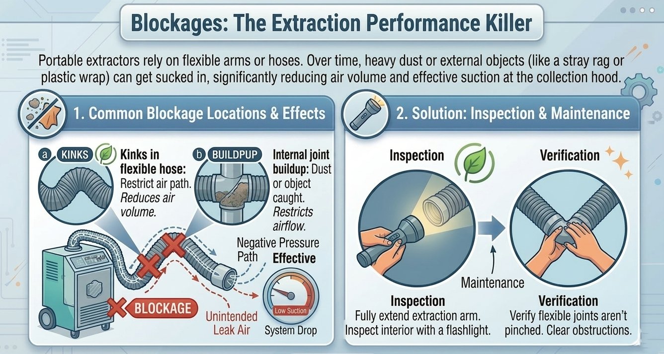 Portable extractors rely on flexible arms or hoses. Over time, heavy dust or external objects (like a stray rag or plastic wrap) can get sucked in.